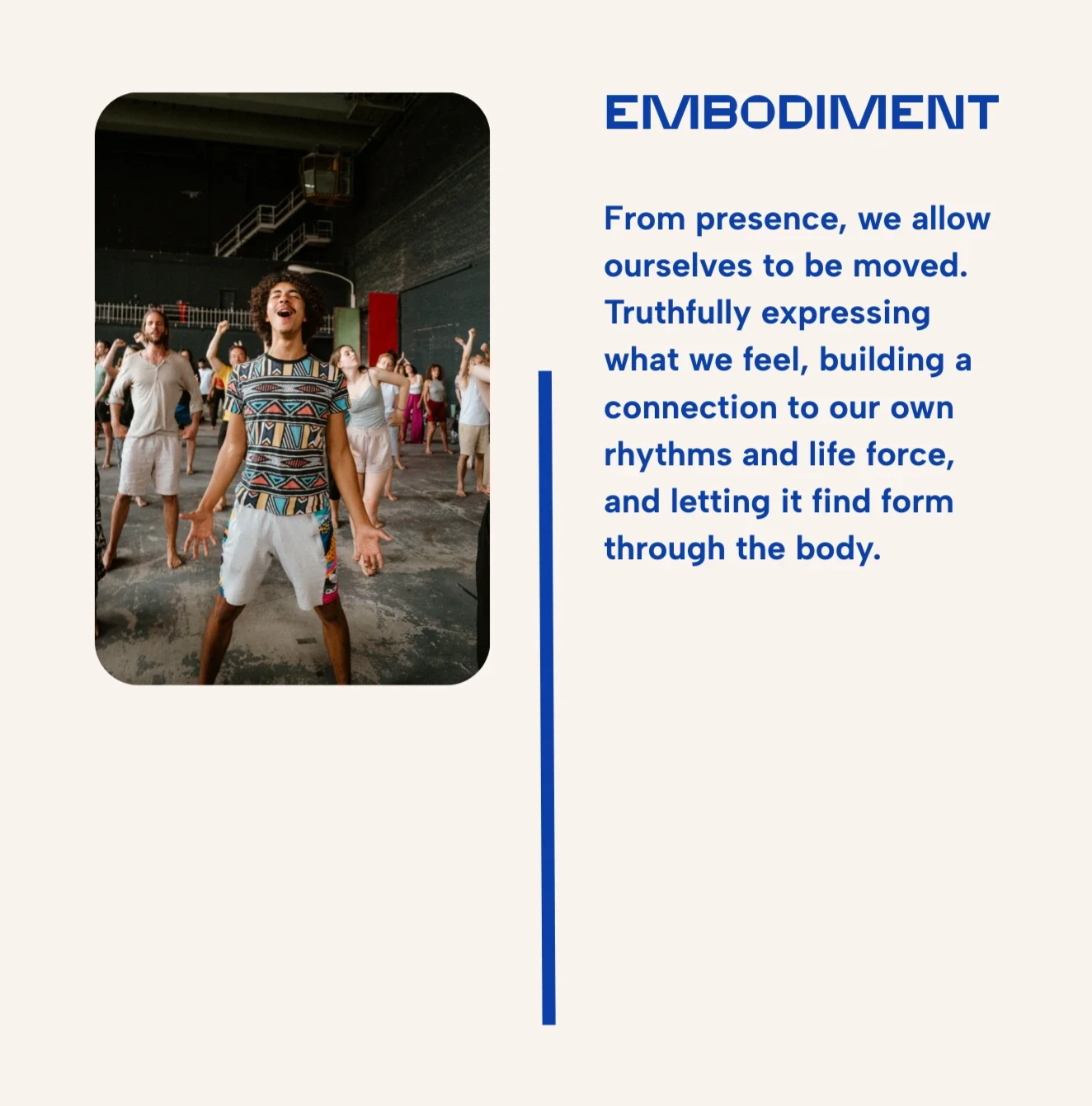 We bring the essence of 10 years of research in dance, movement, somatic work and spiritual development, distilling it into an experience of profound connection.